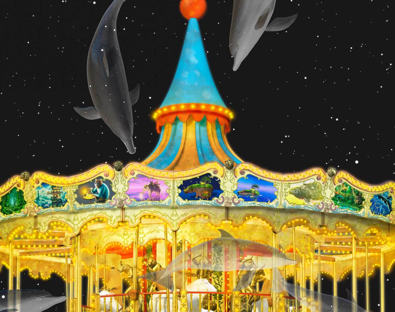 メリーゴーランド カピバラ 羊 ファンタジー 絵画 イラスト CG 3D 幻想 空想 想像 三日月 動物 animal うえだまさのぶ ウエダマサノブ 縄文じいさん